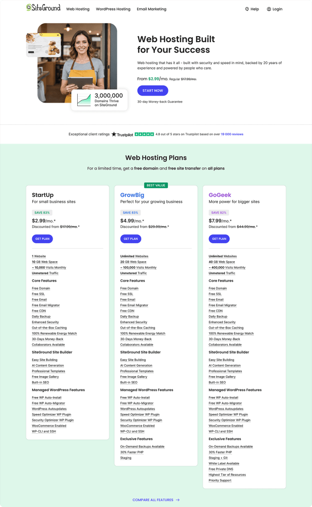 Pricing is often the first thing people look at when choosing a host, and SiteGround isn’t the cheapest option—but that’s because they focus on performance and reliability over bargain-bin pricing. Here’s what their plans look like: